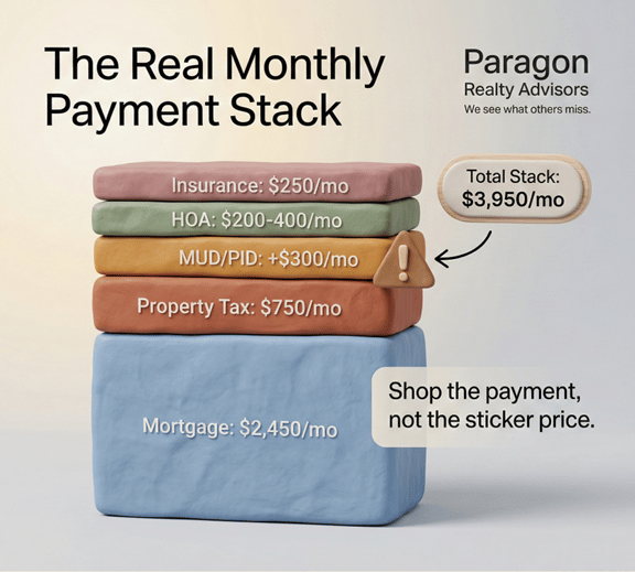 Always underwrite your payment with realistic taxes, MUD/PID, HOA, and insurance included. A slightly cheaper house with higher tax and HOA obligations can cost more monthly than a higher-priced home in a different tax district. On a $450,000 new build in a MUD/PID community with a master-planned HOA, the total monthly stack — mortgage, taxes, MUD, PID, HOA, and insurance — can reach $3,800 to $4,200. That is the number that matters, not the base price.