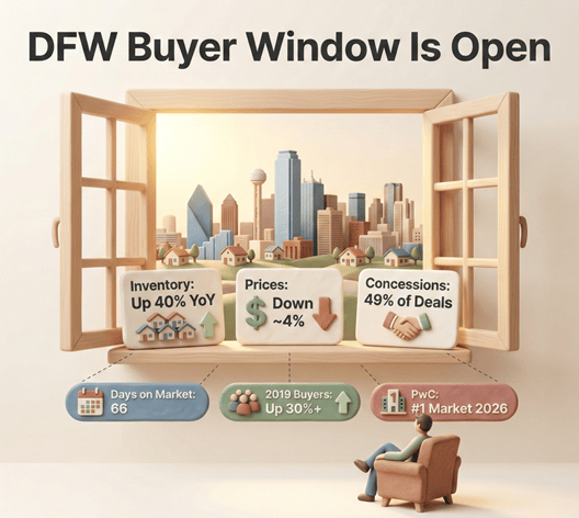 - DFW buyers are sitting in one of the most favorable inventory environments in years, with supply up roughly 40% year-over-year and 49% of deals including seller concessions.